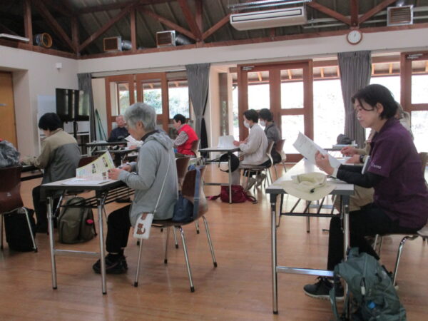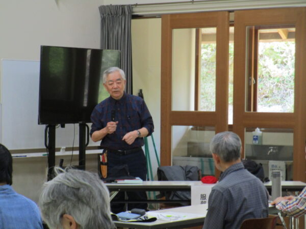 西岡校長より「春真っ只中の本校で、キンラン、ギンランなどを探し、春の自然を楽しみましょう」との挨拶と、講師の服部保先生(兵庫県立大学名誉教授)の紹介があり、第1回大人の自然教室が始まりました。