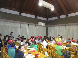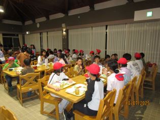 今日の夕食は、大きなエビフライと温かいクリームシチューでした。登山で頑張った体に染みわたり、自然と笑顔がこぼれていました。明日の活動に向け、しっかりとパワーをチャージしました。