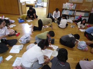 夕食後に、家族の方へ向けてはがきを書きました。今日までの楽しかったことやこれからがんばりたいことなどをはがきいっぱいに書きこんでいました。「明日届いてほしいな。」と南但馬自然学校での事を早く伝えたくてたまらない様子でした。