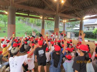 いよいよ5日間の自然学校が始まりました。大屋根広場で、リーダーさんと世界一難しいジャンケンやダンスをして、交流をしました。